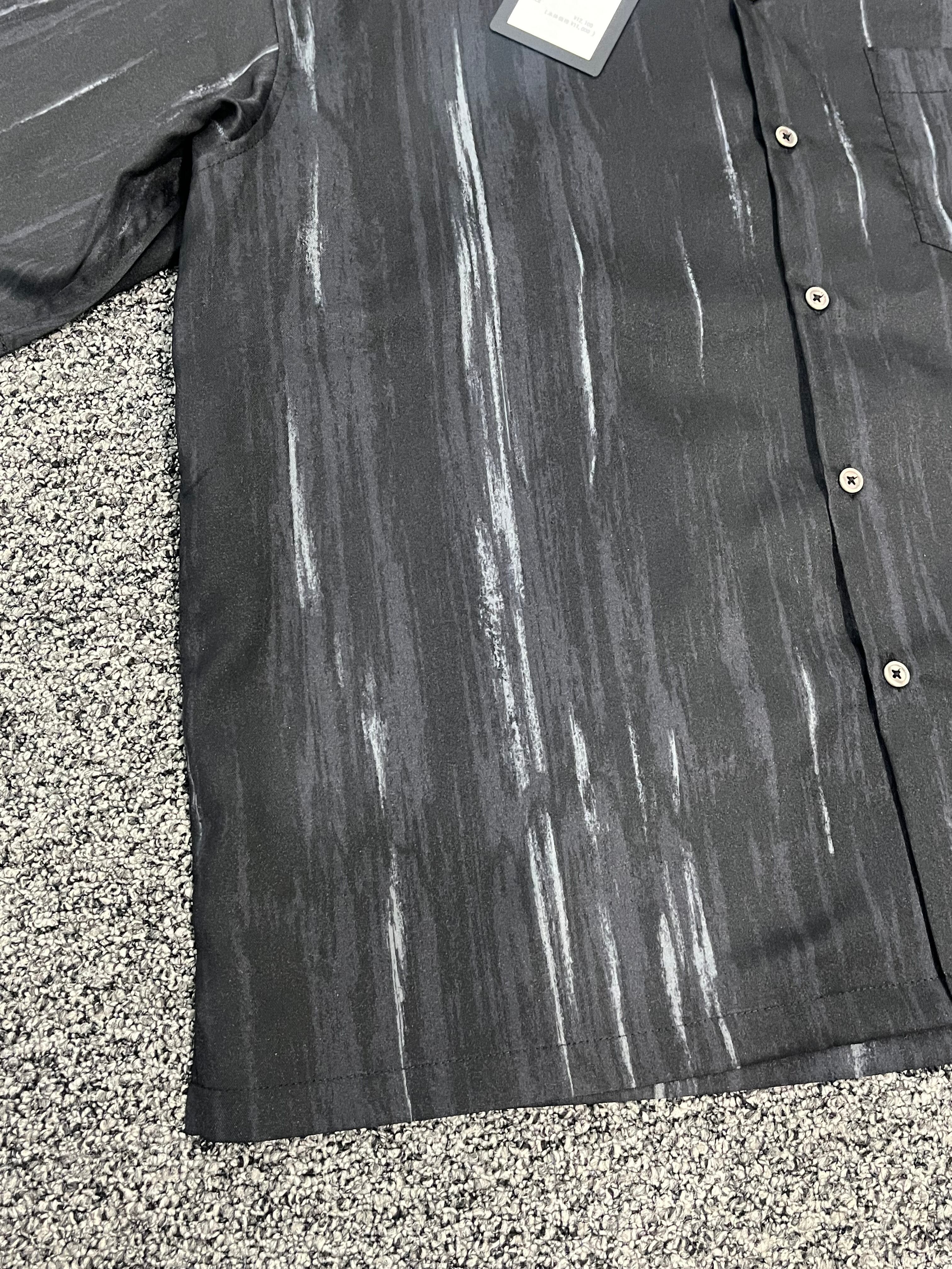 アブストラクト柄を転写プリントしたポリエステルツイル生地を使用したオープンカラーシャツです。
